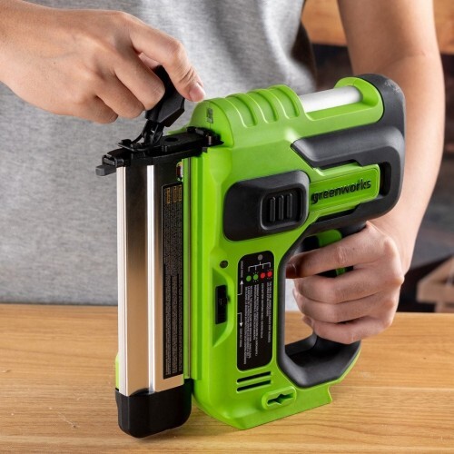 Для комфортно и безопасного использования нейлер Greenworks GD24BN имеет встроенный индикатор состояния, который сообщит о застревании гвоздя, о перегреве, о перегрузке или о том, что закончились гвозди.