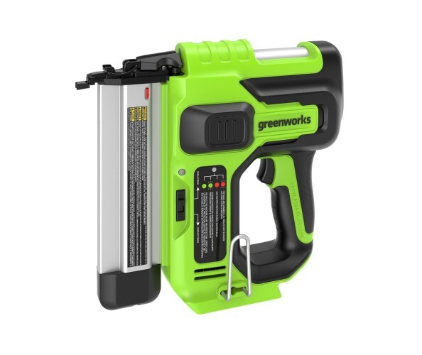 Для комфортно и безопасного использования нейлер Greenworks GD24BN имеет встроенный индикатор состояния, который сообщит о застревании гвоздя, о перегреве, о перегрузке или о том, что закончились гвозди.