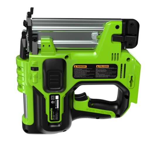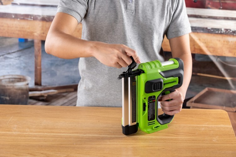Нейлер GD24BN обладает высочайшей производительностью осуществляя до 1200 выстрелов от одного заряда аккумуляторной батареи Greenworks 24V ёмкостью 2 Ач.