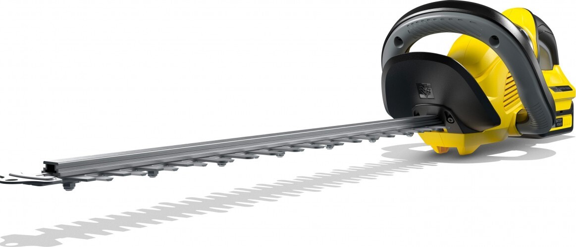 Аккумуляторный кусторез Karcher HGE 18-50 Battery Set, оснащенный поворачивающейся на 180° рукояткой, позволяет выполнять выполнять любые работы по формированию кроны (в т. ч. по вертикальной обрезке) в удобной позе, без переутомления. Аккумулятор и быстрозарядное устройство входят в комплект. Модель отличает ряд практичных деталей: например, наличие предохранителя, предотвращающего непреднамеренное включение, функция пиления, позволяющая легко разрезать довольно толстые сучья, насадка для удаления срезанных листьев, которая не позволяет обрезкам оставаться внутри кроны кустарника, сбрасывая их на землю. Нож длиной 50 см с лезвиями алмазной заточки гарантирует чистый срез. Защитный элемент на конце ножа, оберегающий его, а также строения и полы от повреждений, снабжен отверстием для удобного подвешивания инструмента на стене.