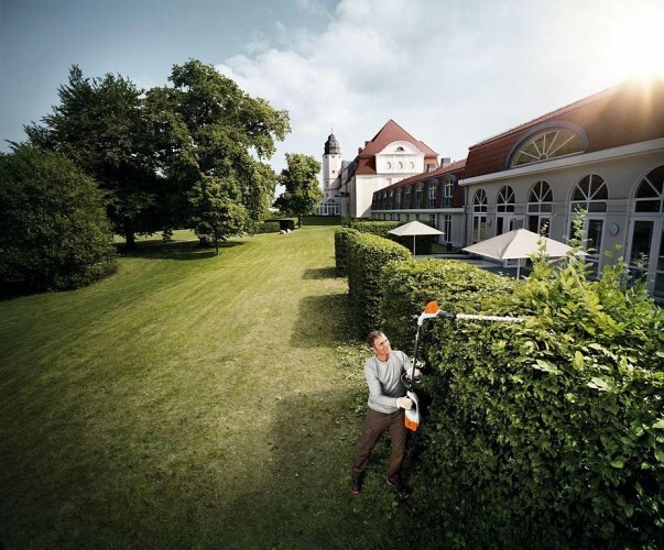 Аккумуляторный мотосекатор для высоких и широких живых изгородей.