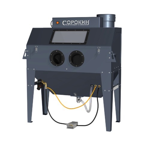 Пескоструйные камеры предназначены для подготовки воздушно-пескоструйным способом поверхностей изделий перед нанесением различных покрытий, снятия ржавчины, окалины, формовочного грунта, снятия слоев краски, снятия заусенцев, сглаживания шероховатостей, матирования, упрочнения и полировки поверхностей. Пескоструйные камеры устанавливаются в цехах и закрытых отапливаемых помещениях. При обработке изделий в камерах в рабочей зоне, где происходит очистка, находятся только руки оператора. Таким образом, для обработки изделий не требуется создавать специальные площадки или выделять отдельное помещение, а также обеспечивать оператора спецодеждой. В комплект входит пистолет с комплектом форсунок и комплект защитных пленок, комплект керамическиx сопел: 6, 6, 7, 7 мм.