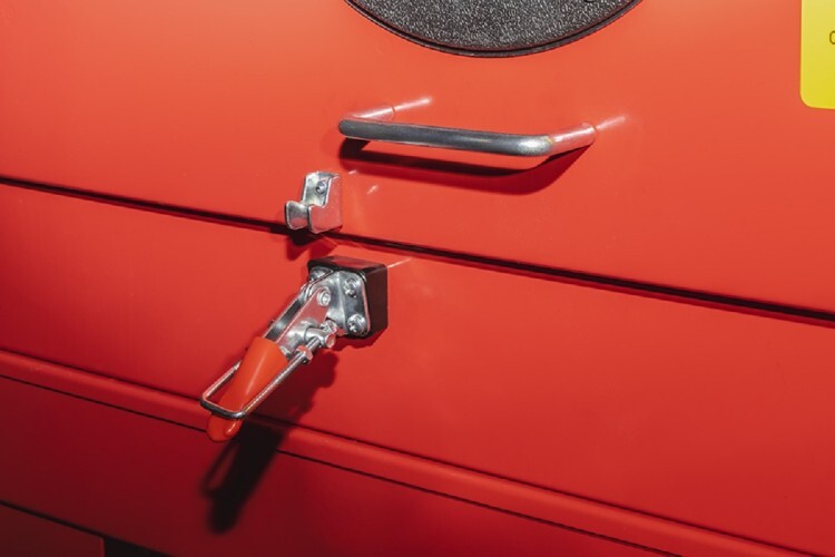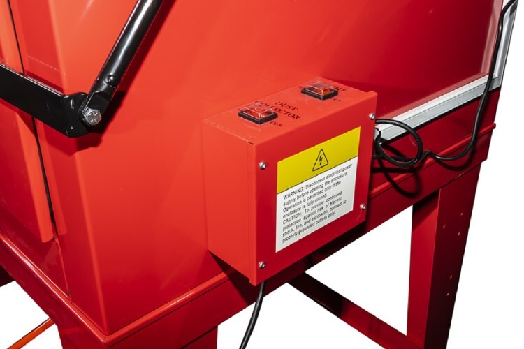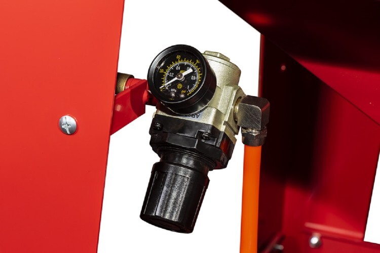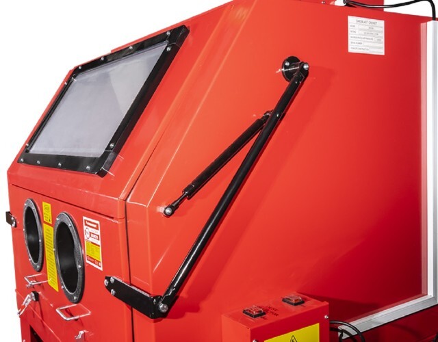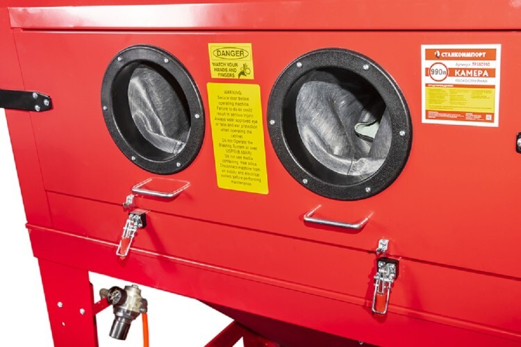 Камера оснащается двумя дверцами, прозрачным стеклом для обзора рабочей области. Опоры соединяются между собой перемычками, что делает конструкцию более жесткой. Имеется ножная педаль для эффективной работы. Не требуется дополнительное снаряжение для защиты оператора. Для работы необходимо подключитель изделие к системе подачи сжатого воздуха.