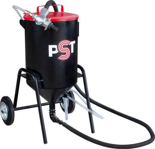 Пескоструйный аппарат PST ИМ-30 — это оптимальное оборудование для проведения пескоструйных работ в ограниченных пространствах. Для большей мобильности агрегат оснащен колесами, а чтобы вибрирующий агрегат прочно стоял, предусмотрены надежные стальные ножки. Сжатый воздух и абразив подаются по разным рукавам, смешиваясь в сопле и поступая в инжекторный пистолет, при помощи которого легко сфокусировать плоскость распыления воздушно-абразивной смеси и скорректировать мощность «удара» струи в диапазоне 3-6 кгс/см2.