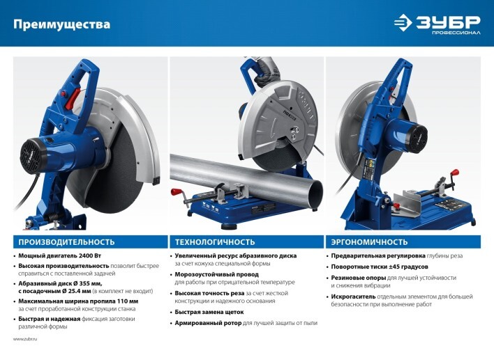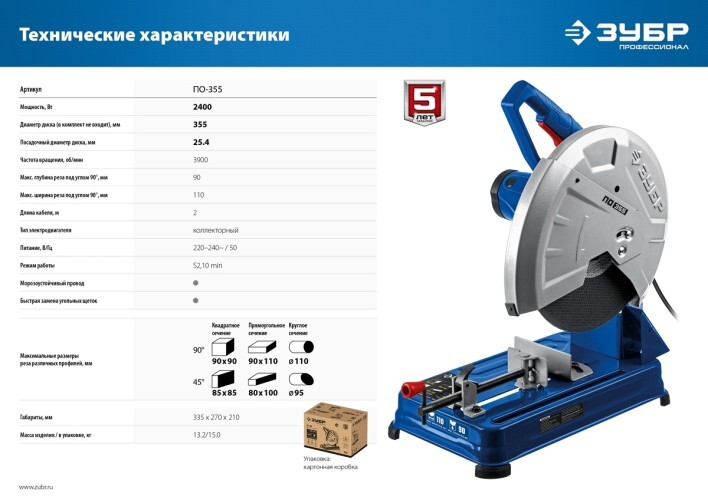 Пила отрезная ЗУБР Профессионал ПО-355 применяется для прямой и косой отрезки металлических заготовок абразивным отрезным кругом.