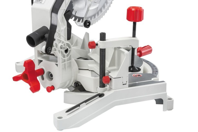 Диапазон регулировки угла наклона растянут на три градуса в обе стороны: до 48° в одну и до -3° от вертикали в другую. Поскольку необходимость установки таких значений возникает редко, механизм имеет жесткие упоры значений 0° и 45°, которые снимаются нажатием на блокирующий штифт. Поворот пильной части относительно стола возможен так же на угол до 48°, но уже в обе стороны. Фиксация выбранного значения производится или вращением рукоятки винтового зажима, или подпружиненным стопором предустановленных значений (0, 15, 22.5, 31.6, 45 и 48°), который снимается нажатием на «язычок» над ручкой.