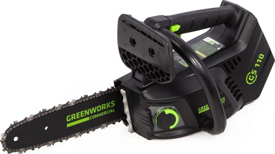 Характеристики этой небольшой коммерческой пилы в сопоставимы с серьезными цепными бензопилами. Ее надежный бесщеточный двигатель DigiPro сопоставим по мощности с бензиновыми аналогами на 1,2-1,5 л/сил. При этом электродвигатель пилы GreenWorks полностью экологичен, имеет высокий крутящий момент и пилит быстрее бензинового аналога, имеет низкий уровень шума и вибраций, а так же прост в эксплуатации потому, что не требует подготовки масло-бензиновой смеси и серьезного обслуживания. Включение пилы производится одной кнопкой. Шина и цепь пилы произведены компанией Oregon. 25-сантиметровая шина сделана из кремнистой стали. Цепь имеет шаг 1/4 дюйма. Для безопасности предусмотрен предохранитель включения и тормоз цепи. Для долговечной работы двигатель имеет защиту от перегрузки. Пила обладает долгим автономным временем работы — до 110 спилов от 4 А/час батареи. Питают инструмент аккумуляторные батареи G-MAX 40V, которые можно использовать с другими устройствами линейки 40V — более 15 устройств.