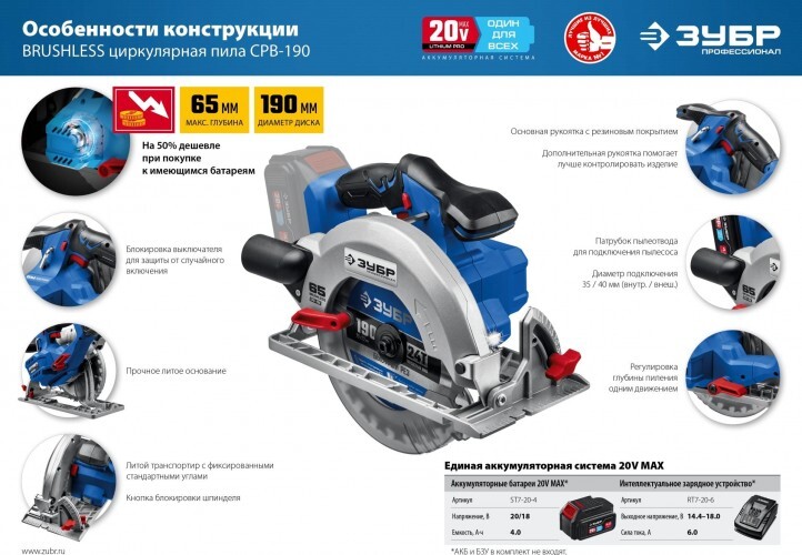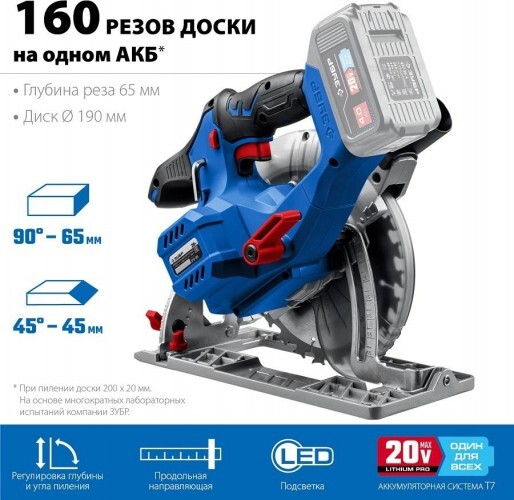 Пила циркулярная аккумуляторная ЗУБР CPB-190 предназначена для распиловочных работ по дереву и иным материалам (при установке соответствующего диска) под различными углами, а также под наклоном.