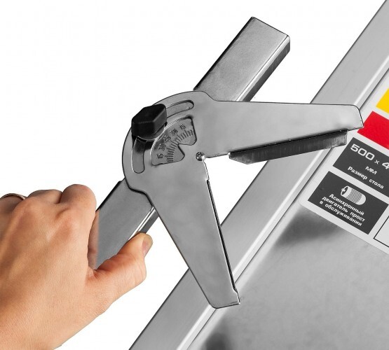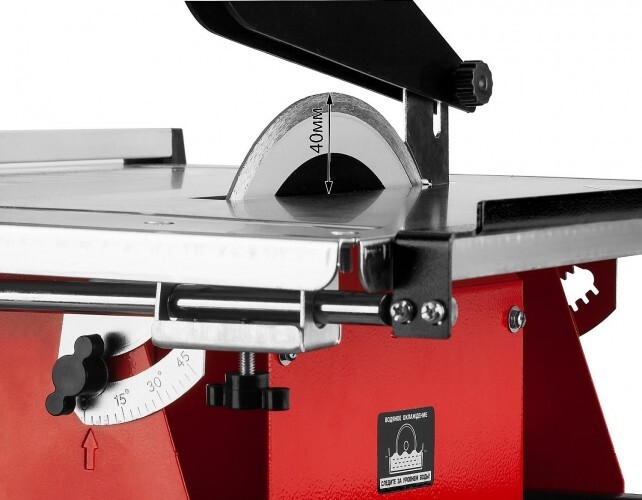 Наклон стола и угловой упор обеспечивают пиление под углом до 45°, косое под 45° и комбинированное