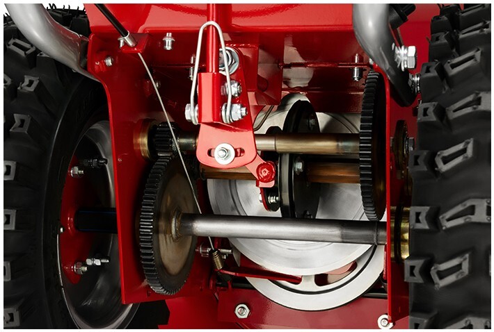 В подметальной машине применяется полностью оригинальная, разработанная на нашей фабрике шестеренчатая трансмиссия с фрикционом MOBIL K TRANSMISSION FG1. В трансмиссии используется специальный фрикционный диск, а цепь заменена на шестерни. Минимальная скорость подметальной машины 0,63 км/ч на полном газу и на первой передаче будет идеальна для уборки мощного слоя снега или пыли. Благодаря компактным размерам трансмисси, инженеры компании увеличили клиренс подметальной машины для работы на сложном рельефе. Подметальная машина имеет 5 скоростей вперед и 2 назад.