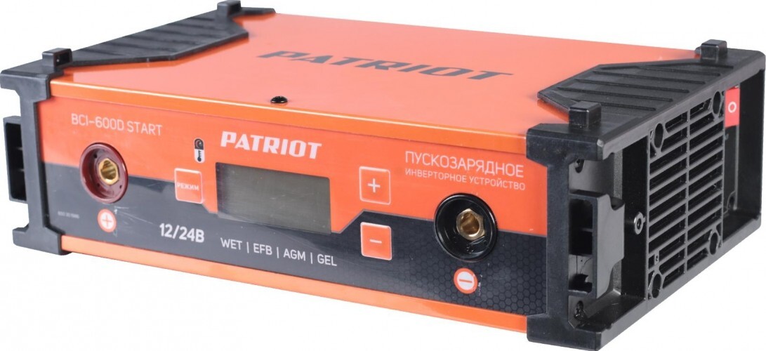 PATRIOT BCI-600D-Start это 4-ступенчатое автомобильное зарядное устройство, которое подходит для зарядки и подзарядки свинцово-кислотных аккумуляторов номинальным напряжением 12В или 24В с жидким электролитом (WET), необслуживаемых аккумуляторов (MF, EFM, EFB), клапанных, абсорбирующих стекловолоконных (AGM) и большинства гелиевых (GEL) АКБ.