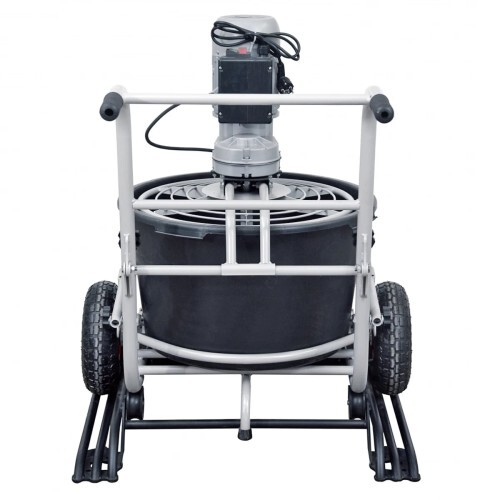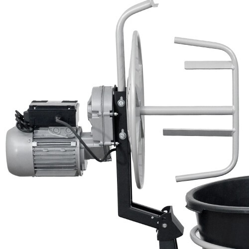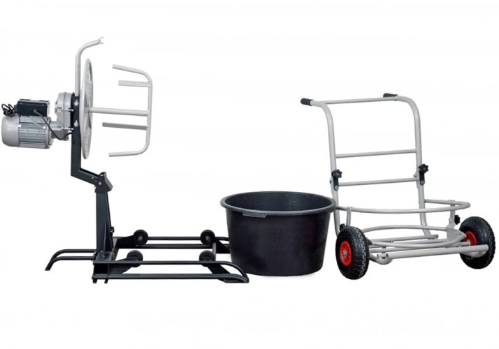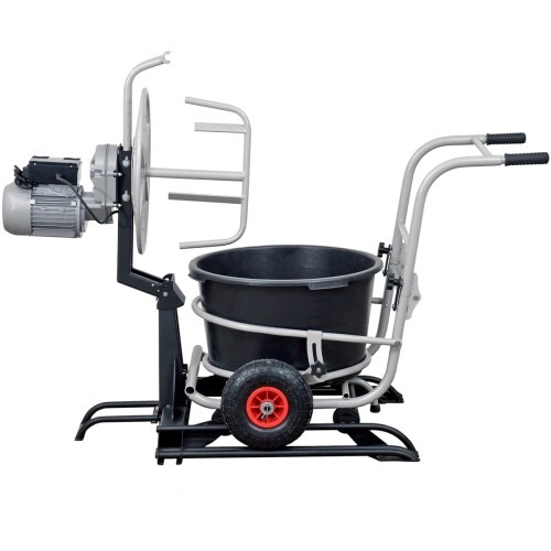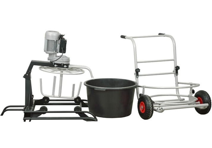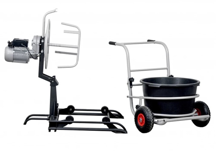 Отдельная станция с мотор-редуктором – это удобно. Ее можно расположить возле розетки, а готовый раствор перемещать на тележке. При этом не нужно использовать удлинители и делать смесь рядом с рабочим местом, шнур питания не будет мешать, кроме того, перемещается только смесь на тележке – это легче, чем передвигать всю установку.