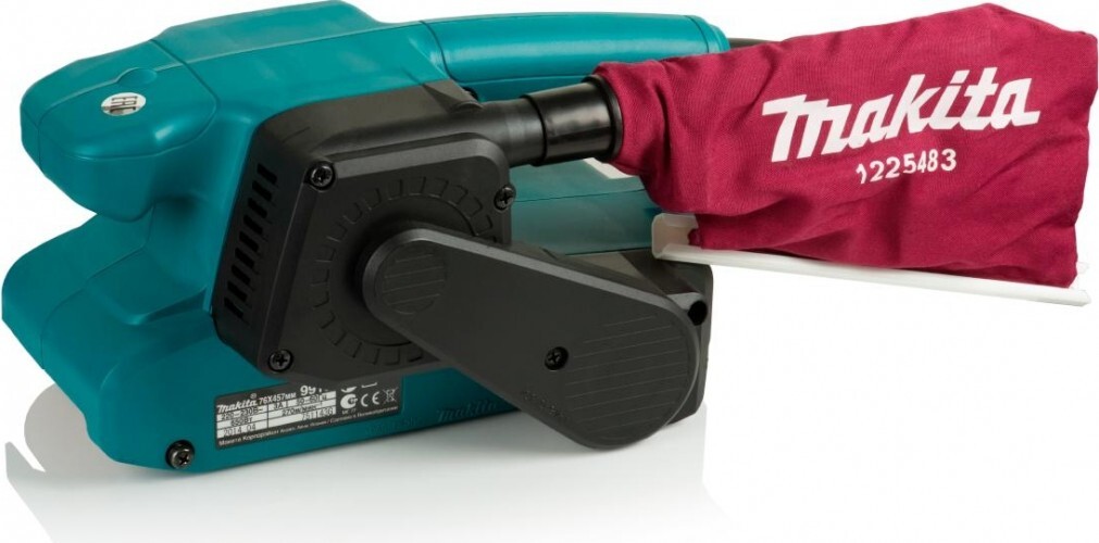 Шлифмашина ленточная сетевая MAKITA 9910 - можно использовать стационарно, абразивной лентой вверх, и тогда ленточная шлифмашина превращается в настоящий станок, при установке струбцины. Подобного тип этот профессиональный инструмент справится прекрасно, потому что его конструкция и компоновка на это и рассчитана. Обработка материала производится движущейся со скоростью 270 м/мин абразивной лентой шириной 7,6 см, натянутой между двумя роликами в нижней части машины. За функционирование инструмента отвечает щёточный электромотор с энергопотреблением 650 Вт. Такой мощности достаточно для продолжительных рабочих циклов. Удобство длительной эксплуатации обеспечивает кнопка включения с функцией блокировки на рукоятке. Процесс замены абразивной ленты существенно упрощён благодаря специальному рычажному механизму — установка и демонтаж выполняются в одно движение. Ключевым параметром качества работы является правильная центровка ленты на роликах. Даже минимальный перекос может привести к повреждению краёв ленты и ускоренному износу установочных элементов (аналогично ситуации с ремнём ГРМ в автомобиле). Для предотвращения подобных проблем в конструкции предусмотрен регулировочный винт, позволяющий достичь идеальной центровки. После первоначальной настройки система поддерживает правильное положение ленты автоматически. Компактные размеры (длина 262 мм) и масса 2,6 кг обеспечивают комфортную эксплуатацию. Разработчики намеренно подобрали такой вес, чтобы исключить необходимость дополнительного давления при работе — достаточно естественного веса инструмента. Эффективное пылеудаление реализовано через патрубок в верхней части корпуса. Конструкция соединения оптимизирована для удобного подключения как штатного пылесборника, так и внешнего пылесоса с шлангом стандартного диаметра 28 мм. Пользователи отмечают превосходное расположение и форму патрубка по сравнению с аналогами других производителей.