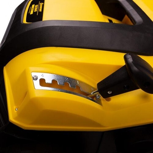 Регулировка глубины обработки устанавливается с помощью центрального рычага и имеет 4 уровня. Для аэрации можно выбрать глубину обработки в диапазоне от -13 до -1 мм. Для скарификации от -9 до 3 мм. Собранная с газона трава и листья попадают в тканевый травосборник объемом 55 литров травы, что позволяет за один раз обработать газон средней площади. Вес электрического скарификатора 12 кг, что не составит труда перемещать его. Рукоятка управления регулируется по высоте и складывается.