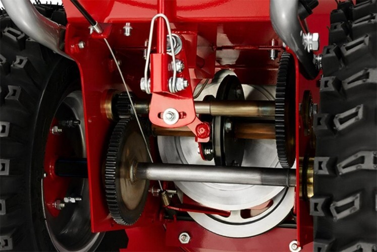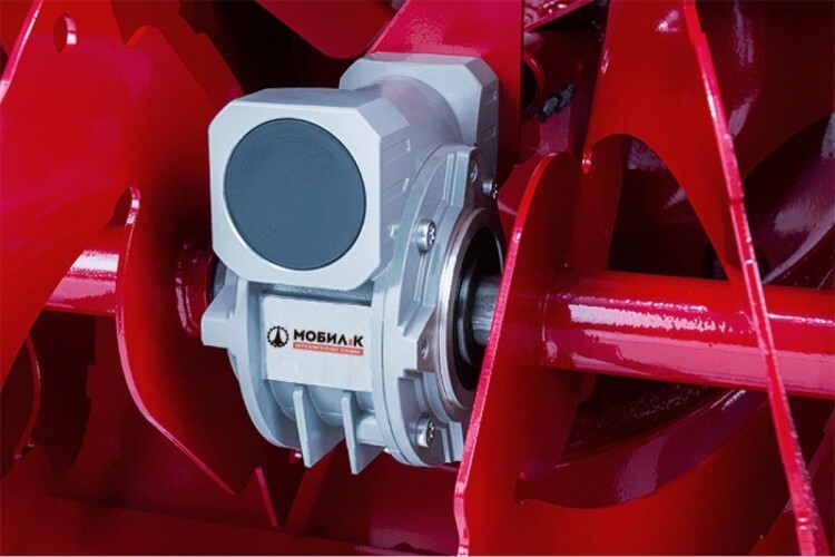 В конструкции шнека снегоуборщика используется алюминиевый редуктор в масляной ванне и усиленный червяк и червячное колесо с передаточным отношением 1:7, что на 30% увеличивает скорость вращения шнека по сравнению с обычными редукторами. В конструкции также установлена усиленная турбина-крыльчатка с увеличенными ребрами жесткости, что позволяет сделать ее более прочной. Работа червячной пары в масляной ванне существенно увеличивает ресурс редуктора. Для снижения вибрации и увеличения надежности, редуктор дополнительно фиксируется к корпусу стальными пластинами. В местах крепления шнека и турбины-крыльчатки применяются подшипники.