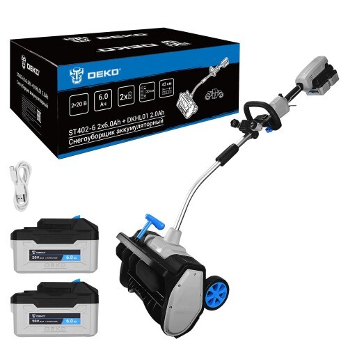 Снегоуборщик аккумуляторный DEKO ST402-6, 2*20В, 2*6.0Ач со съёмной фарой DEKO DKHL01 2.0Ач предназначен для уборки небольших территорий от снега. Снегоуборщик имеет сниженный уровень шума и не загрязняет окружающую среду. Снегоуборщик аккумуляторный оснащен телескопической ручкой для более комфортной работы. Аккумулятор, поставляемый в комплекте, обладает повышенной токоотдачей.