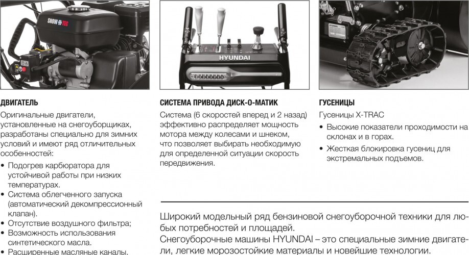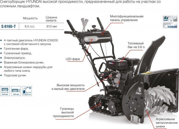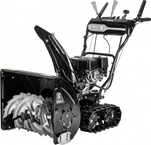 Hyundai S 6165-T - гусеничный самоходный бензиновый снегоуборщик, с шириной захвата снега 61 см, и высотой ковша 51 см. Компактная и маневренная снегоуборочная машина, которую стоит купить для загородного дома, дачи.