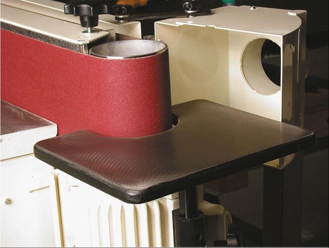 Станок оборудован выносным столом, расположенным напротив натяжного ролика ленты. На нём выполняют операции по шлифовке криволинейных кромок. Стол регулируется по высоте.