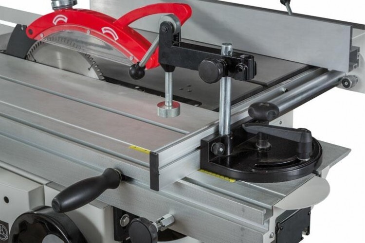 Станок оборудован подвижным столом (кареткой), ход которого составляет 1600 мм. При работе на нем деталь фиксируют при помощи углового упора, эксцентрикового прижима или продольного упора. В стандартный комплект входит и расширение подвижного стола с телескопической опорой и раздвижным поворотным упором заготовки. В разложенном состоянии его длина составляет 2200 мм, в сложенном 1200 мм.