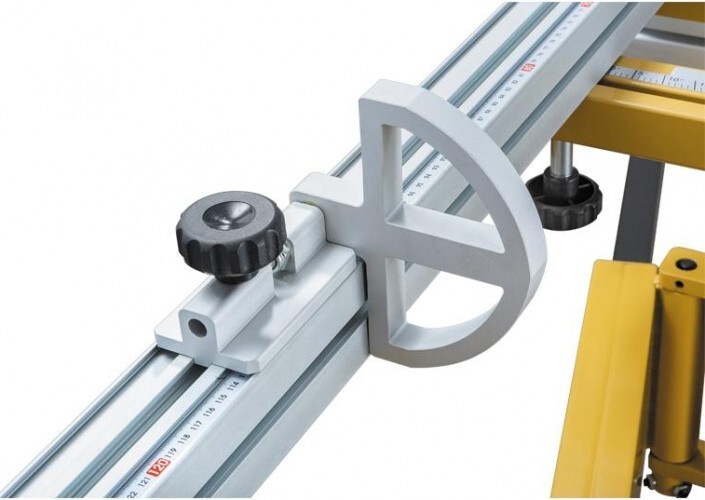 Кроме параллельного упора, расширения и удлинения стола в стандартную комплектацию входит каретка с собственным расширением на телескопической опоре. Конструкция оборудована раздвижным упором с откидным «башмаком», регулируемым продольным упором и прижимом. Сам подвижный стол сделан из экструдированного алюминиевого профиля, а его направляющие из стали, они устойчивы к износу и рассчитаны на долгий срок службы. Основной неподвижный стол из чугуна, из него же пильный модуль с мотором, подрезным и основным пильным диском.