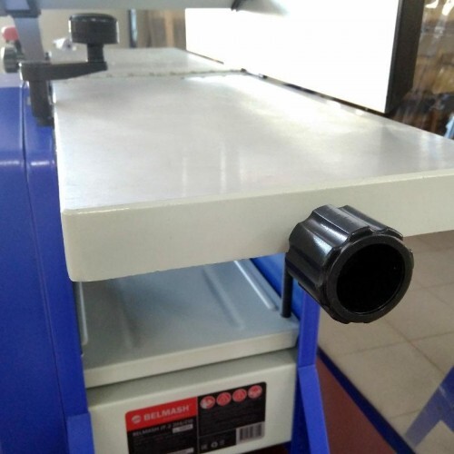 Нижний рабочий стол – для рейсмусования, выполнен из стали. Нужная высота рейсмусования настраивается с помощью рукоятки. Вал оснащен двумя ножами.