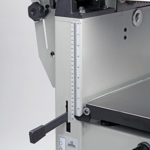 На станке установлена линейка, которая показывает расстояние от режущего вала до рейсмусового стола. Она продублирована механическим счетчиком.