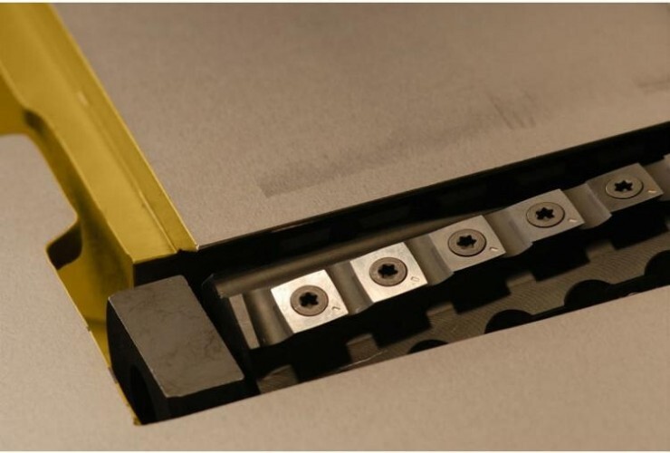 Строгальный вал helical с твердосплавными режущими сегментами, расположенными в несколько рядов по спирали. Каждое лезвие имеет четыре режущих кромки, что кратно увеличивает его ресурс. Станки с такими валами имеют ряд общих достоинств: отличное качество строгания, в том числе свелеватой древесины, отсутствие ударных нагрузок при работе и характерной дробной структуры на проструганной поверхности, низкий уровень шума, небольшой размер отходящей стружки (упрощает аспирацию отходов), высокий ресурс ножей и, соответственно, продолжительные межсервисные интервалы.