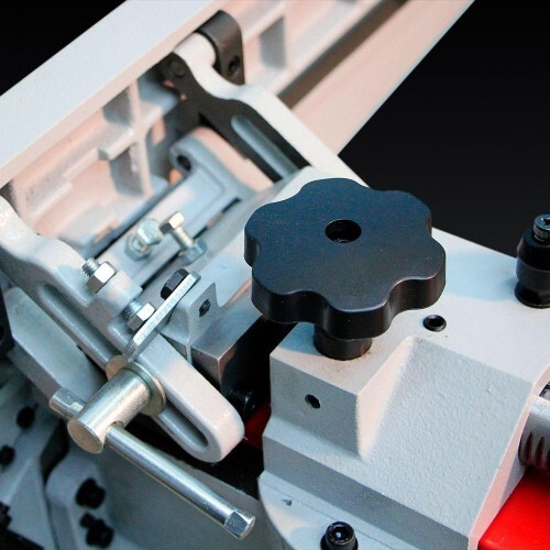 Приемный столы просто регулируется маховиком с удобной фиксирующей рукояткой. Подающий стол регулируется быстродействующим рычагом.
