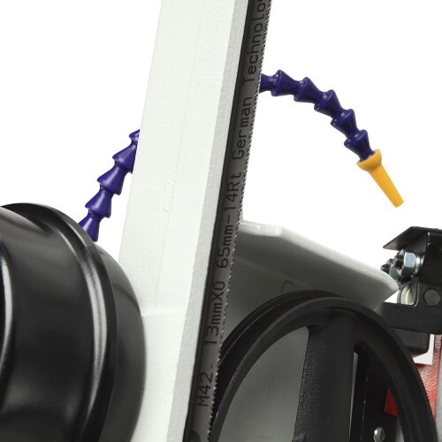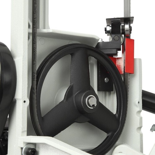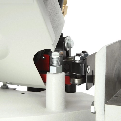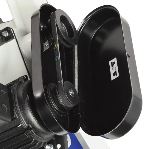Станок оснащен мощным асинхронным двигателем 550 Вт, S1, работающим от сети 400 В. Переключение между тремя скоростями резания 20/29/50 м/мин осуществляется простым перекидыванием клинового ремня. Натяжение пильного полотна регулируется специальной ручкой, что обеспечивает стабильную работу и продлевает ресурс оборудования.