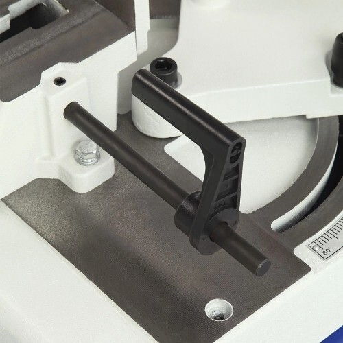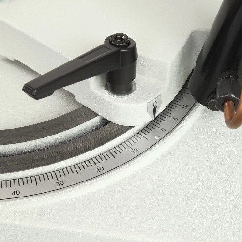 Пильная рама опускается с помощью гидравлической системы, скорость подачи которой можно регулировать клапана на гидроцилиндре. Это позволяет адаптировать станок для работы с разными материалами. После завершения реза автоматический выключатель останавливает пилу, что значительно упрощает процесс, особенно при серийном производстве. Подъем рамы осуществляется вручную, а встроенная компенсационная пружина снижает требуемое усилие. На станке можно производить угловые резы в диапазоне от -60° до +45°. Точная установка угла производится по градуированной шкале, что обеспечивает высокую точность обработки.