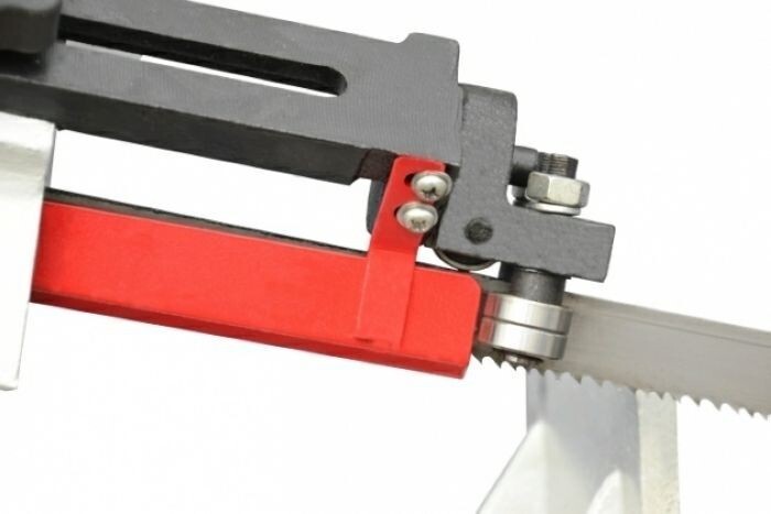 Тиски предназначены для фиксации заготовки и могут регулироваться в зависимости от положения угла поворота пильной рамы. Движение широких губок производится маховиком, что позволяет надежно удерживать заготовку во время работы.