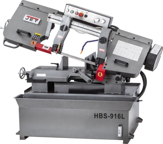 Модель HBS-916L имеет регулируемые направляющие, предназначенные для прохода ленточного полотна в зависимости от формы заготовки и ее диаметра. Наличие направляющих предотвращает возникновение вибрации полотна, уход полотна в сторону. Направляющие укомплектованы блоком подшипников и твердосплавными сухарями, осуществляющими позиционирование полотна непосредственно под прямым углом к поверхности обрабатываемой заготовки. Качество пиления обеспечивается подачей СОЖ в зону резания. Сила натяжения полотна обеспечивается поворотом маховика, установленного в левой, торцевой части консоли. Ленточнопильный станок оборудован поддоном для сбора стружки и отработанной жидкости. Вес станка в полном снаряжении составляет 300 кг.