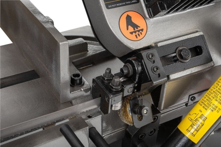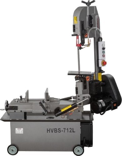 Модель HVBS-712L имеет направляющие, передвигающиеся по консоли. С помощью направляющих можно установить оптимальную величину прохода пилы, повышая качество распила и увеличивая срок эксплуатации ленточного полотна. Направляющие оснащены подшипниками, регулирующими позиционирование ленточной пилы относительно обрабатываемой заготовки, обеспечивая точность распила. На нижней части пильной рамы установлена кордщетка для очистки полотна от стружки. Станок оборудован системой подачи СОЖ непосредственно в зону резания. Натяжение ленточного полотна регулируется вручную.