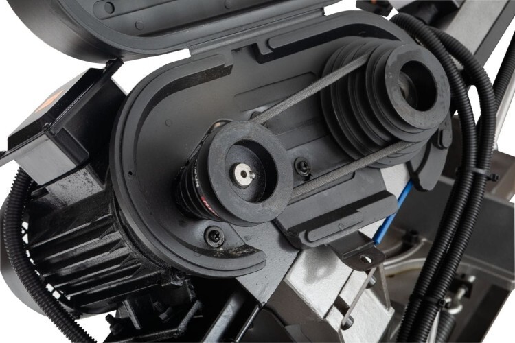 Ременная передача позволяет осуществлять смену скорости движения ленточного полотна. Станок может выполнять распил заготовок в четырех режимах скорости движения полотна 22, 33, 45 и 65 м/мин. Включение двигателя осуществляется через блок управления.