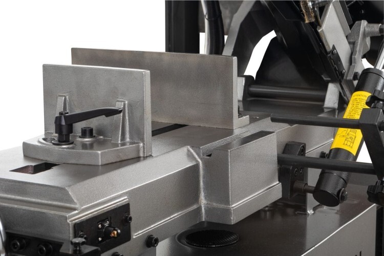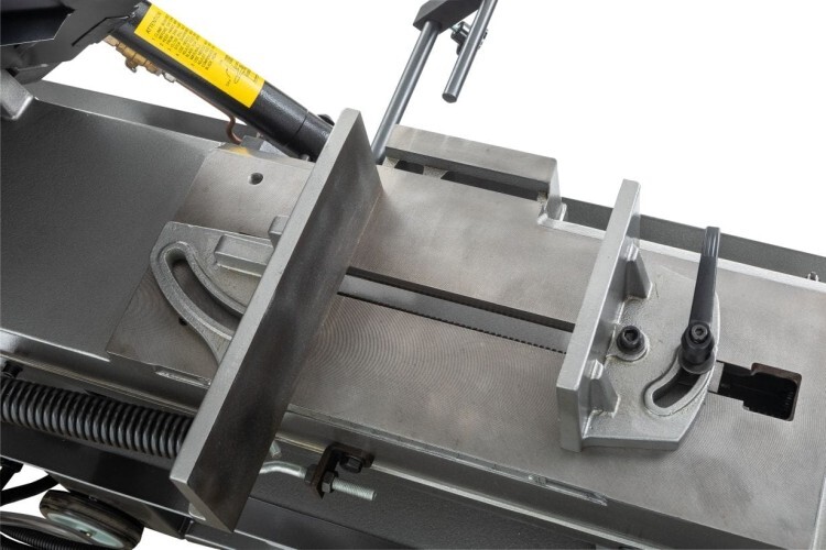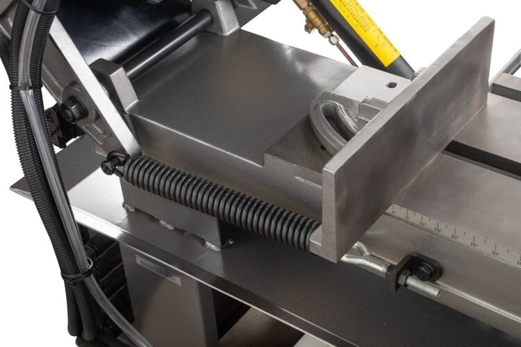 Сила прижима консоли и скорость подачи рамы регулируется с помощью гидроцилиндра. Модель HVBS-712L позволяет осуществлять распил заготовок в вертикальном положении.