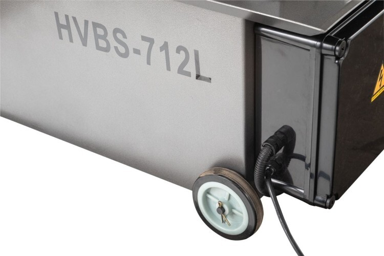 Модель HVBS-712L имеет направляющие, передвигающиеся по консоли. С помощью направляющих можно установить оптимальную величину прохода пилы, повышая качество распила и увеличивая срок эксплуатации ленточного полотна. Направляющие оснащены подшипниками, регулирующими позиционирование ленточной пилы относительно обрабатываемой заготовки, обеспечивая точность распила. На нижней части пильной рамы установлена кордщетка для очистки полотна от стружки. Станок оборудован системой подачи СОЖ непосредственно в зону резания. Натяжение ленточного полотна регулируется вручную.