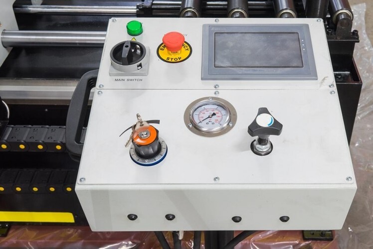 На основной панели расположены: цветной сенсорный дисплей, с помощью которого можно задать программу и отслеживать процесс пиления, регулятор скорости опускания пилы и кнопка аварийного останова.