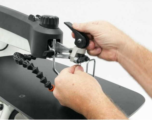 Станок работает с пильными полотнами без штифта. Верхняя часть пилки зажимается эксцентриковым механизмом, совмещенным с натяжителем, нижняя предварительно зажимается в адаптер, а после вставляется в вилку-оправку. В комплекте два таких адаптера, что позволяет иметь в быстром доступе полотна разных типов. Благодаря наличию прорези в рабочем столе существенно упрощается установка на стол заготовок с продетой пилкой.