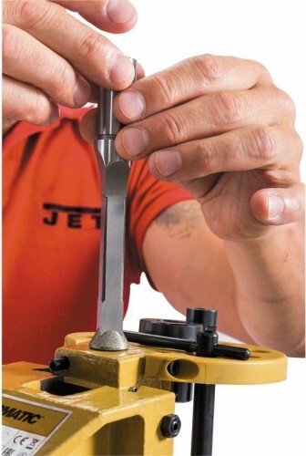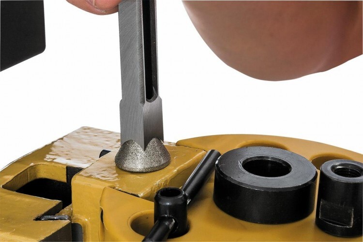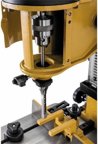 Подача сверлильной части производится длинной изогнутой рукояткой под удобный хват, она установлена на шлицах и быстро регулируется по высоте. Также предусмотрена возможность ее крепления с другой стороны корпуса под левую руку. Снизу на клиновых направляющих расположен – концевой упор со стопорным винтом, сверху – круглый кронштейн для хранения принадлежностей и конический алмазный инструмент для заточки долбежной части пазовальных сверл. При использовании «долбяков» с разными хвостовиками используют переходные втулки из комплекта поставки; при их монтаже возникает необходимость регулировать высоту установки, для чего есть две откидных дистанционных пластины-прокладки.