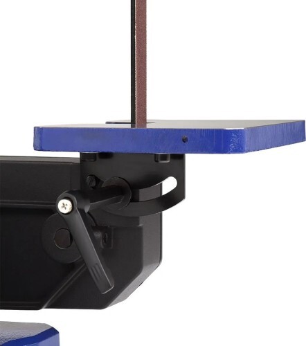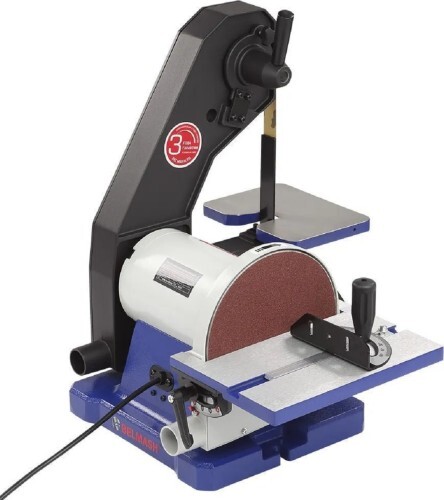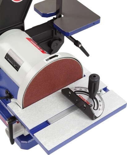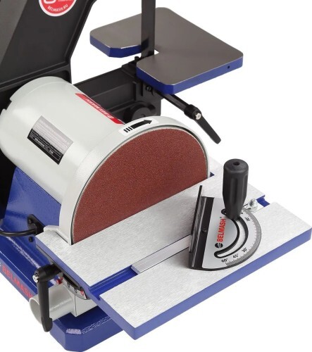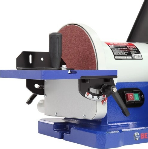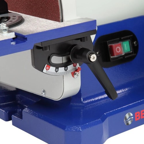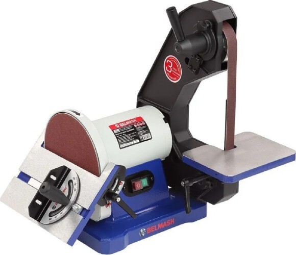 Небольшие габариты станка обеспечивают его легкую транспортировку и хранение. Шлифовально-дисковый узел имеет регулируемый рабочий стол с углом наклона 0-45°. Рабочий стол выполнен из алюминиевого литья. На столе предусмотрен Т-образный паз для установки углового упора. Диапазон угла поворота упора составляет -45°...+45°.