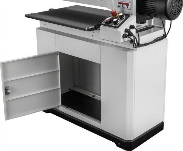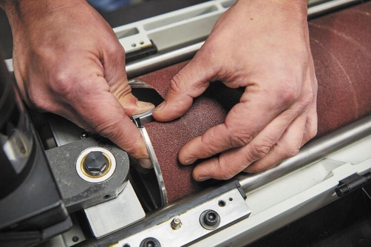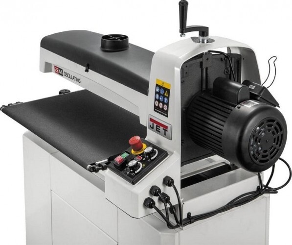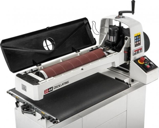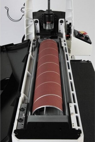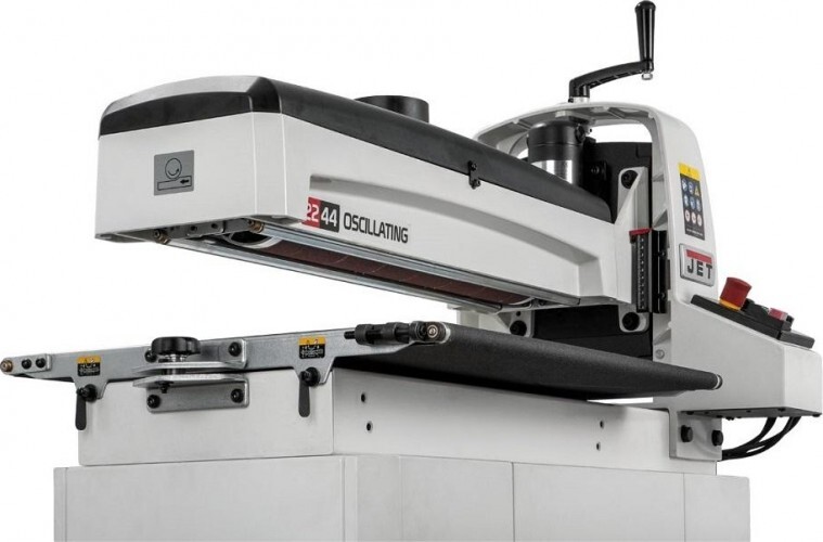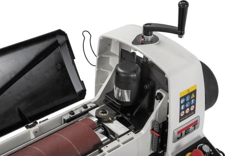 Еще одна особенность станка – система SandSmart, управляющая скоростью подачи. Она отслеживает величину нагрузки на основной двигатель и, если та поднимется до критической, снижает скорость конвейера. Как только сложный для шлифования участок будет пройден и нагрузка снизится, контроллер увеличит скорость подачи до изначально заданной оператором.Как и все барабанные шлифователи Jet, этот оборудован системой, облегчающей замену абразивного материала. Во-первых, сам барабан выполнен легкосъемным. Во-вторых, оптимальное натяжение намотанной на него ленты задается автоматически при помощи специального пружинного механизма; он же компенсирует растяжение материала при износе.
