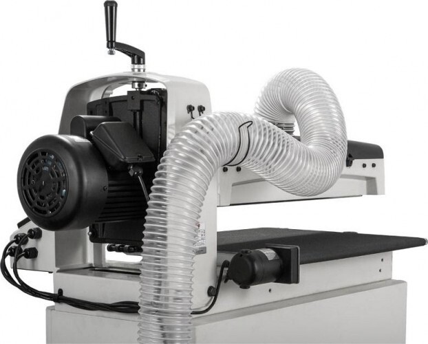Основу конструкции составляет чугунный корпус, на котором смонтирован конвейер автоподачи и консоль со шлифовальным барабаном. За счет такого размещения ширина заготовки не ограничена габаритами шлифовального узла. Высота барабана меняется при помощи регулировочной рукоятки, что позволяет настраивать величину просвета до транспортера в пределах от 0,8 до 100 мм. Операция по настройке параллельности основания и оси барабана производится без использования вспомогательных инструментов.