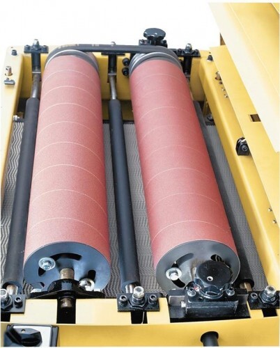 Конструкция с двумя валами позволяет использовать абразивы с разной зернистостью, то есть за один проход производить грубую и финишную шлифовку. Для достижения наилучшего результата предусмотрена точная регулировка положения выходного вала относительно приёмного, высоту которого подбирают в зависимости от зернистости абразива. Регулировка по высоте производится независимо за счет опускания транспортёрного стола. Он размещен на четырёх опорах и регулируется с точностью до 0,2 мм по всей ширине. На практике, разброс толщины после шлифовки на хорошо настроенном DDS-225 значительно меньше. При такой точности станки способны снимать за один проход до 1,5 мм по всей ширине, необходимо лишь правильно подобрать абразив и скорость подачи (2 или 3 м/мин).