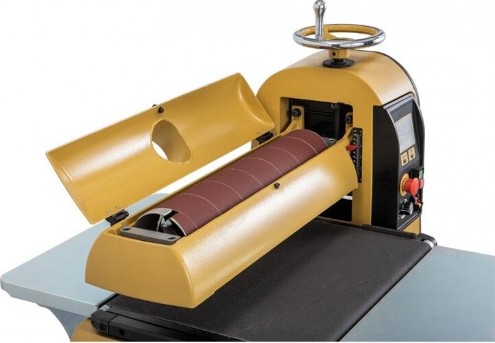 Для регулировки высоты положения шлифовального барабана предусмотрен массивный маховик с полированной поверхностью. Положение можно контролировать по привычной шкале на корпусе, но можно и по цифровому индикатору, так нагляднее и точнее. Он имеет переключатель режима отображения (дюймы/ миллиметры) и кнопку сброса для установки нулевого положения, что удобно как при смене толщины заготовок, так и при переходе к другой зернистости абразива. В качестве последнего используется лента шлифовальной бумаги, намотанная на алюминиевый барабан. Ее концы фиксируются в специальных зажимах, обеспечивающих простоту фиксации и автоматическое натяжение.