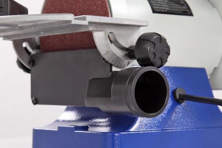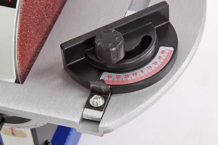 Дисковый шлифовальный узел имеет регулируемый рабочий стол с углом наклона 0 - 45 град. Выполнен из алюминиевого литья. На столе предусмотрен П-образный паз для установки углового упора, который имеет диапазон углов от -45 до +45 град.