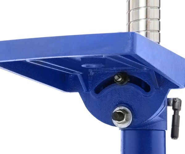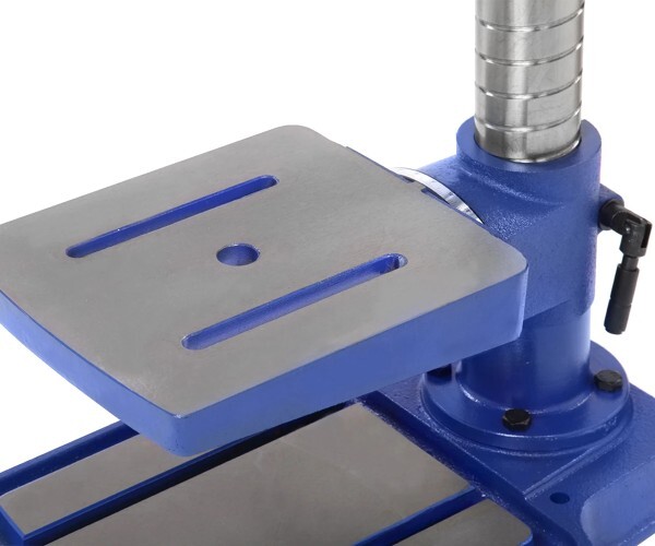 Рабочий стол имеет размер 277×246 мм, возможность наклона от - 45 до +45 градусов, регулировку по высоте и два паза под установку тисков (входят в комплект поставки) или других зажимов. Стол способен выдерживать нагрузку до 30 кг. Основание станка - это не только надежная опора, но и рабочая поверхность 345×520 мм, а Т-образные пазы позволят надежно закрепить заготовку.