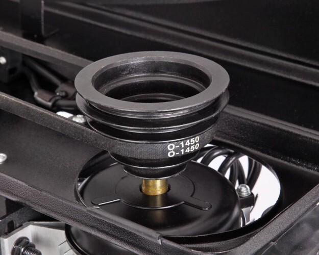 Двигатель асинхронный, мощность 600 Вт. Станок рассчитан на подключение к трехфазной сети 400 В. Имеется пять ступеней скорости шпинделя (от 500 до 2500 об./мин.). Переключение производится за счет переброски ремня. Для этого необходимо открыть крышку ременного отсека, ослабить барашек крепления двигателя, тем самым получив возможность смещения шкива, перекинуть ремень и проделать операцию в обратной последовательности.