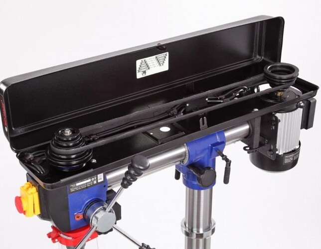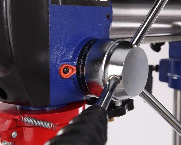 Ход пиноли (80 мм), настраивается с помощью шкалы, расположенная на рукоятке регулировки глубины сверления. Наконечники тройной рукояти удобной формы, что способствует плавной подаче сверла к заготовке. На станке предусмотрен лазерный указатель, который позволяет точно определить точку входа режущего инструмента в заготовку.
