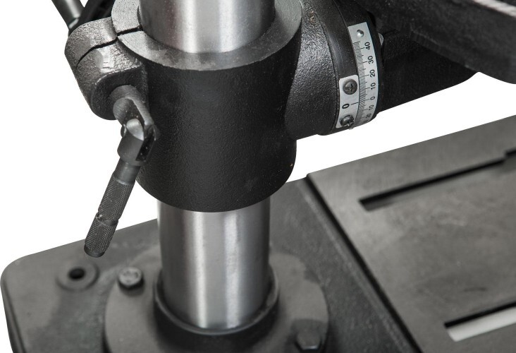 Станок укомплектован чугунным столом, регулируемым по углу установки и по высоте; реечный механизм с вращающейся рукояткой облегчает перемещение по вертикали. Сверлильная часть выполнена литой из чугуна. Для контроля глубины сверления предусмотрена шкала с миллиметровой и дюймовой разметкой, а также регулируемый ограничитель. Стандартная комплектация включает в себя удобный быстрозажимной патрон и станочные тиски для фиксации заготовок.