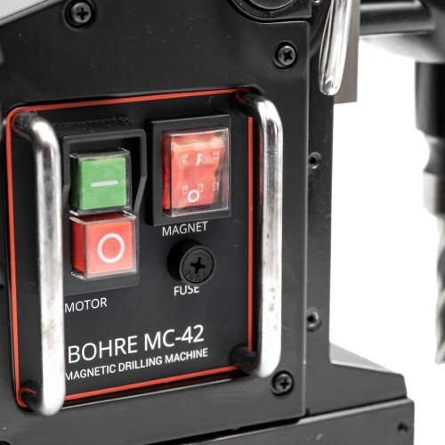 Портативный станок на магнитном основании Bohre [Борэ] МС-42 предназначен для точного сверления отверстий в различных конструкциях и изделиях из стали. Станок оснащен магнитным основанием промышленного класса и может использоваться в любом положении — как вертикально или горизонтально, так и для сверления снизу вверх. Посадочное отверстие шпинделя под хвостовик Weldon 19,05 мм позволяет быстро и просто устанавливать корончатые сверла по металлу длиной до 55 мм и диаметром до 42 мм и спиральные сверла с диаметром до 13 мм. В конструкцию станка интегрирована система подачи смазочно-охлаждающей жидкости (СОЖ), что обеспечивает эффективное, чистое сверление и продление срока службы корончатых свёрл.